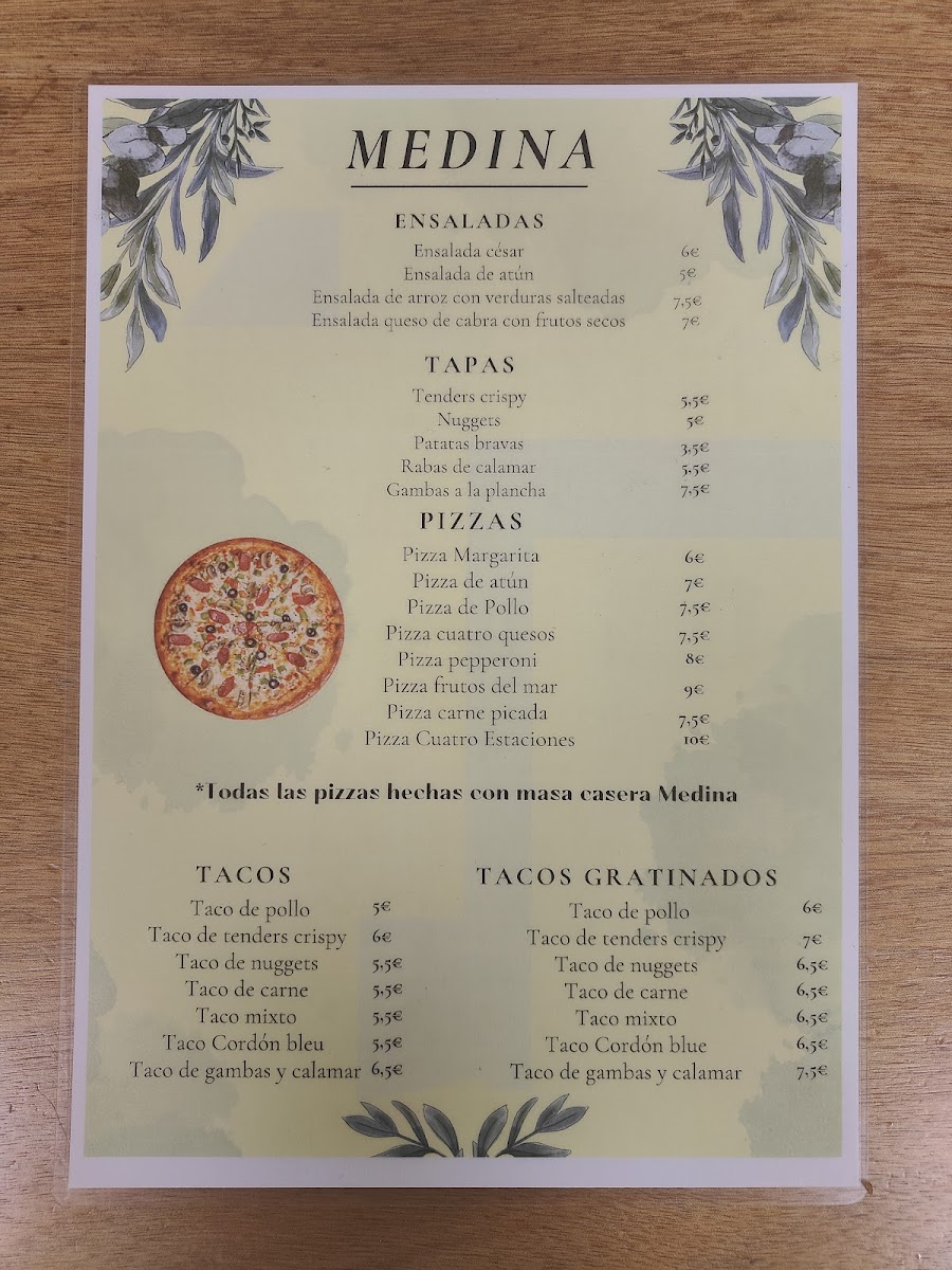 Welcome to Restaurant Medina, nestled in the heart of Manresa, Barcelona, where culinary delights await. This vibrant eatery offers a diverse menu that masterfully blends traditional Mediterranean flavors with contemporary flair. Guests can savor homemade pizzas crafted with an authentic dough, from the classic Pizza Margarita to the indulgent Pizza Frutos Del Mar featuring fresh seafood. Each dish is an invitation to explore new tastes while providing generous portions that promise satisfaction.